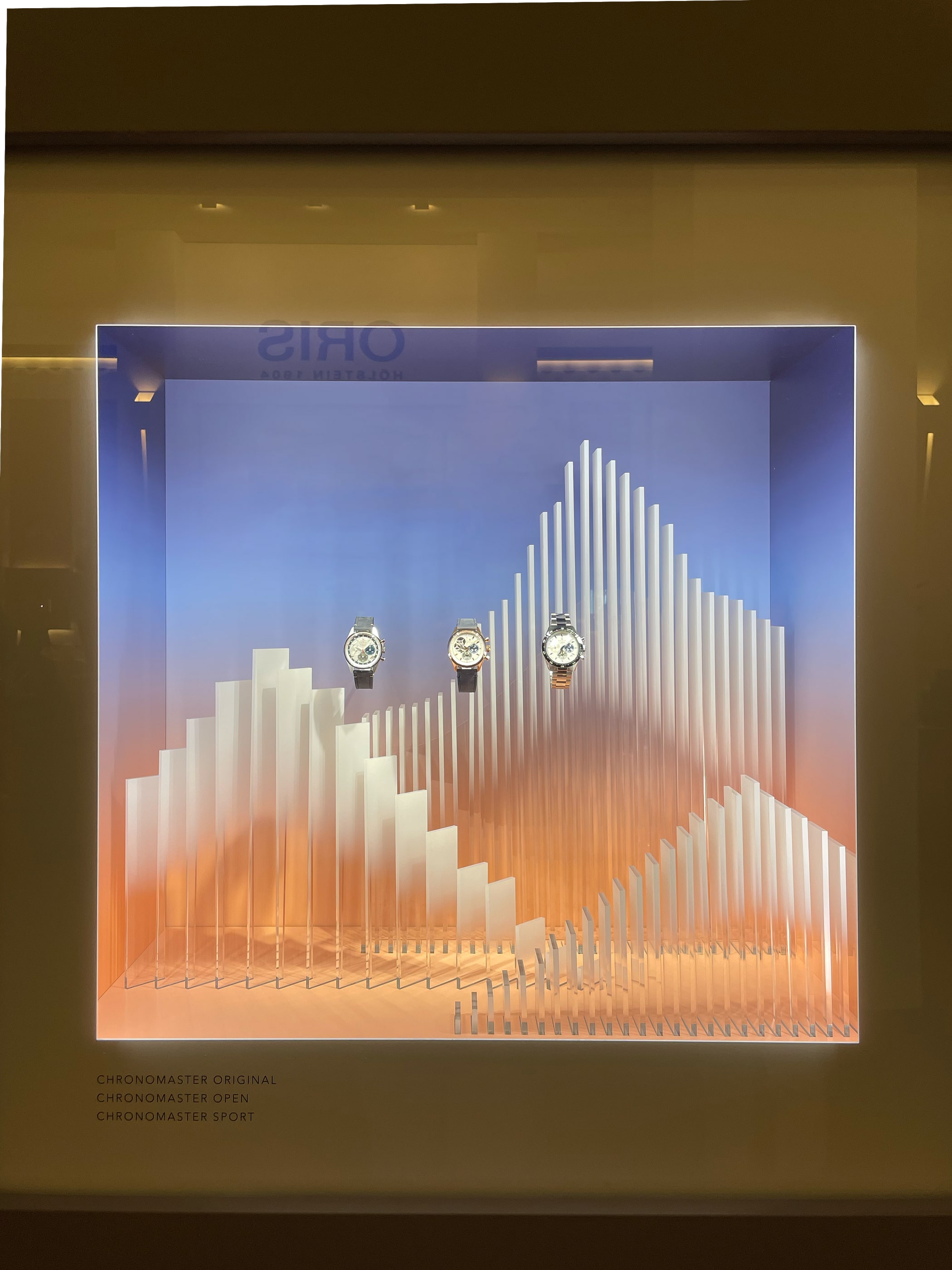 Chronomaster – Rythmes et transparences : une série de lamelles en PMMA transparent imprimé en dégradé représentant les montagnes compose un relief graphique qui joue avec la profondeur et les reflets. Les volumes cadencent l’espace tout en laissant flotter les modèles Chronomaster.