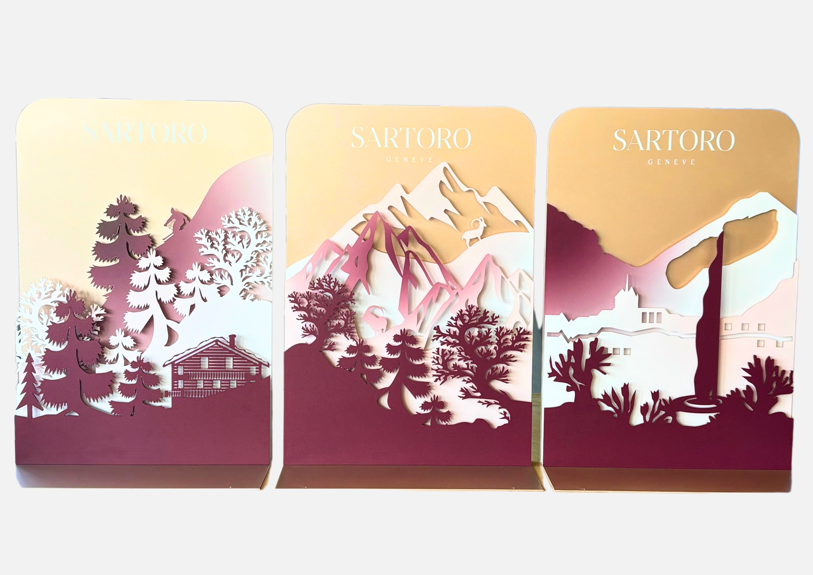 Conception, développement et fabrication de displays sur mesure pour les vitrines de joaillerie, reflétant les couleurs et origines de la marque. Un design signé MH Décors, intégrant les valeurs et codes esthétiques de la marque de haute joaillerie Sartoro.